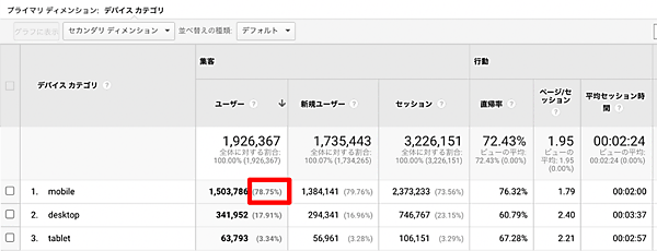 井水:「ユーザー>モバイル>概要」から確認してみましょう。全体の約78%がモバイルでした。
