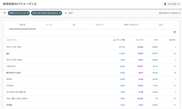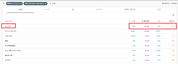 井水:あくまでGoogleの検索エンジンの中でですが、検索されて表示された回数と、クリックされた数でクリック率が決まります。あとは掲載順位が何位だったかもわかります。さっき言っていた「平坂寛」さんが9位に出てきました。