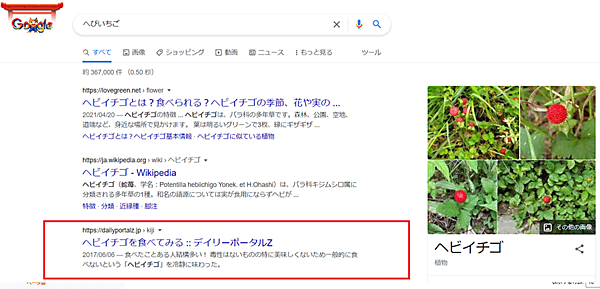 井水:次の検索キーワードを見てみましょう。「へびいちご」ですね。