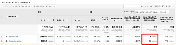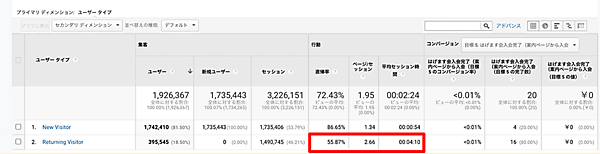 まずサイトには新規の人とリピーターの人がいるので、これを把握しましょう。「ユーザー行動>新規顧客とリピーター」から確認できます。新規が81%ですね。ただ、直帰率やページセッション、平均セッション時間を見るとリピーターの方がサイトを読んでいますよね。