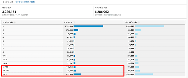 井水:新規が多いので1回の人が一番多くて、どんどん下がっていくのは予想通りですが……。51回以上訪問されているセッションから10万を超えて特に201回以上のところ42万ってすごいですね!