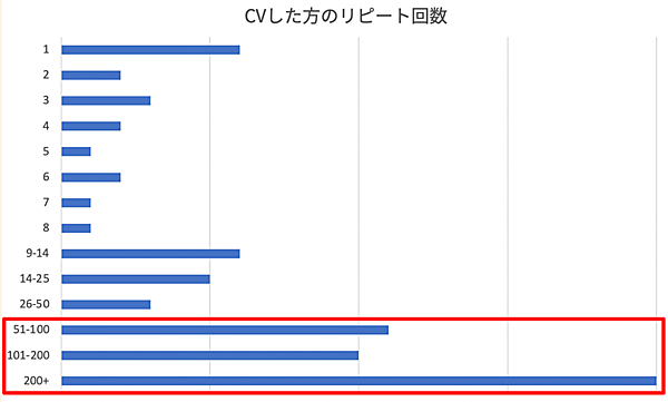 これを見るとボリュームゾーンが51回以上〜にできているので、会員に申し込んでもらうためにはリピート回数が重要という点も確認できました。