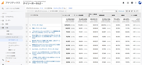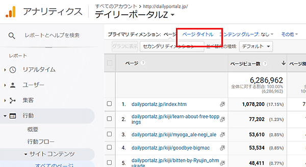 まずはよく読まれている記事を見てみましょう。「行動>サイトコンテンツ>すべてのページ」を開きます。そのままだとURLが表示されているだけでわかりにくいので、「ページタイトル」をクリックして表示を切り替えます。