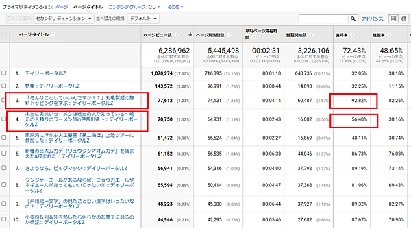 井水:なるほど(笑)。さて、先ほど説明した通り、見るべきポイントの2つ目は離脱率と直帰率です。記事を読んだ後にすぐサイトから去ったのか、他の記事も読んだのかがわかる指標が直帰率です。たとえば、3位の丸亀製麺の記事は直帰率92%なので、10人来たら9人以上が帰っています。でも、4位のラーメンの記事は56%なので、2人に1人くらいは他の記事を読んでいます。