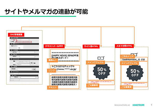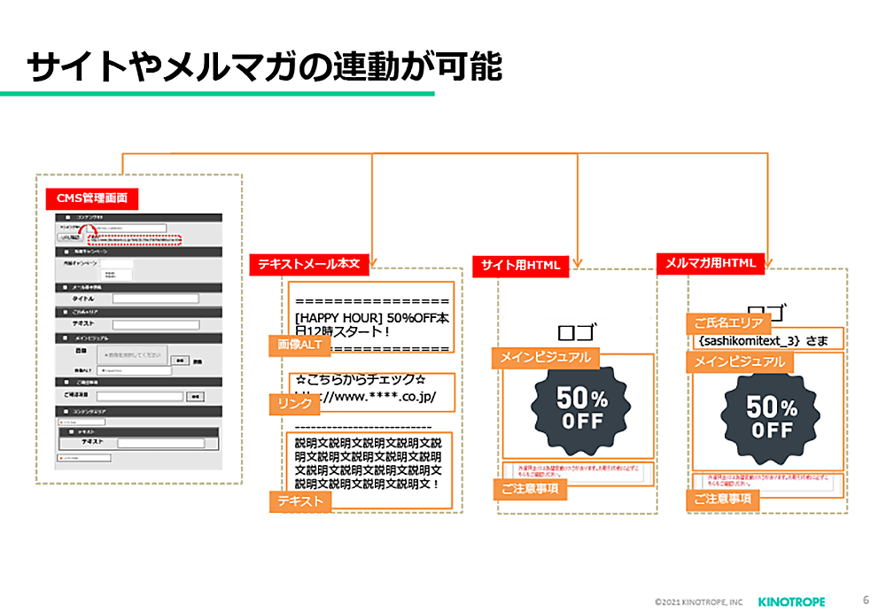 たとえば次の図のように、管理画面で作成すれば、自動的にサイト用、HTMLメール用、テキストメール用としてアウトプットできるようになります。