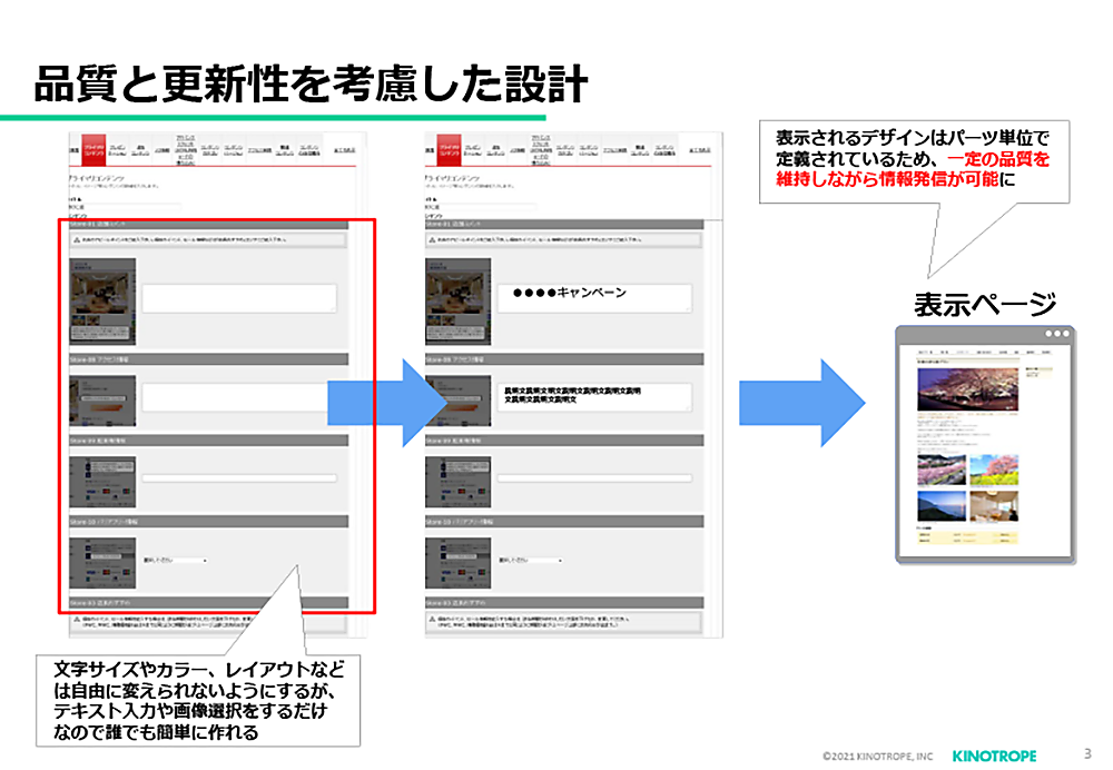 一方、自社のデザインコンセプト、ルールをCMSに反映し、文字サイズやカラー、レイアウトなどは自由に変えられないように設定することで、一定の品質を維持しながらページの作成・更新を効率的に行えるようになります。