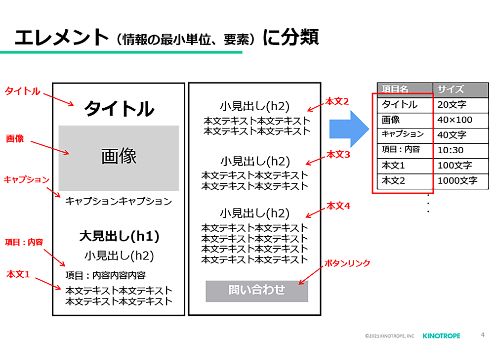 - 掲載する文章にはどのような要素(エレメント)があるのかを整理する。たとえばタイトルや本文といったエレメントに分類し、表示する順番を決める。