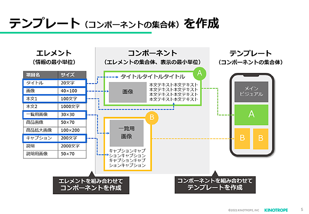 このように、CMS上に、コンポーネントとテンプレートという形で整理しておくことで、ページを作成・更新する際にはコンポーネント単位で追加・削除・入れ替えを行えばよいことになります。毎回、デザインに時間をかける必要もなく、ユーザーに知ってほしい情報をのせたページを「早く」「たくさん」作ることができるようになるわけです。