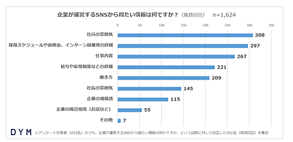 では、リアルな情報とは具体的にどういった情報でしょうか? 企業が運営するSNSから得たい情報として新卒者は「社員の雰囲気」「仕事内容」「給与や雇用制度などの詳細」を知りたいと回答しています。