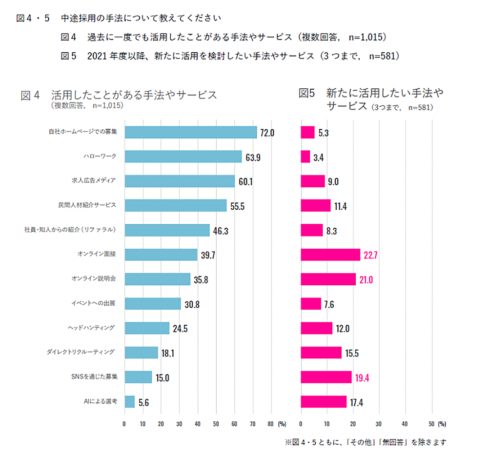 一方、企業側も、SNSの活用を前向きな意識で捉えています。コロナ禍により、オフラインでの採用活動を積極的に行えない環境で、中途採用において、オンライン面接・オンライン説明会・SNSを活用した募集を、新たな取り組みとして積極的に進めています。