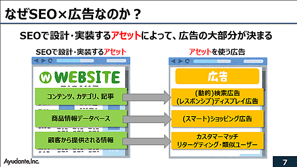 このように、現在の広告運用は、広告のアセットだけで完結することはなく、ウェブサイトの基盤となるSEOのアセットを使っていく。この意味でSEOと広告は深く結びついているというわけだ。