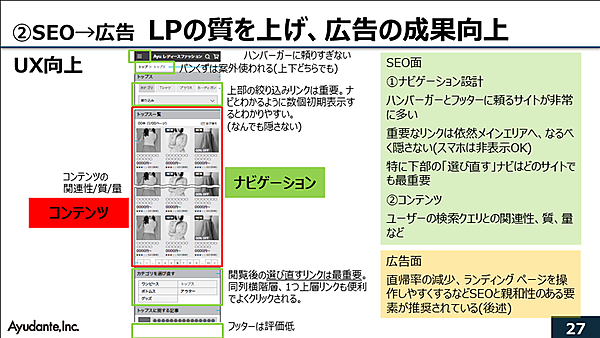 2つ目のケーススタディで取り上げるのは広告のCVRを上げたい、集客後の直帰率や回遊性を改善したいという課題だ。SEOでLP(ランディングページ)のUXとパフォーマンスを最適化し、広告の課題を解決していく。SEO面でランディングページの改善というとh1にキーワードを入れる、strongタグを使う、リンクのアンカーテキストにキーワードを入れるといったhtmlのチューニングが主流であったが、Googleの進化にともない最近ではページの使いやすさ(UX)と、速さ(パフォーマンス)が重要になっているという。