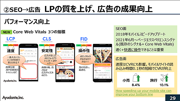 Googleは表示速度だけではなく、スマートフォンで快適に操作できことが重要だと考えている点は留意したい。表示速度の改善は広告にも大きな影響を与える。モバイルサイトの読み込み時間の0.1秒の改善によって小売り系のサイトで8.4%以上、旅行業のサイトで10.1%以上、CVRが向上したという調査データもある。モバイルサイトの読み込み速度は広告担当者にとっても重要な指標だ。