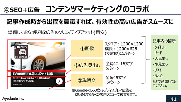 なお、広告を出稿することがわかっているならば、記事作成時にサムネイル画像、見出し、説明文など広告に使う要素を記事段階で考慮して作っておくとよいと寳氏。広告出稿時に、慌てて素材探しや準備をしなくていいので、有効性の高い広告がスムーズに出せる。