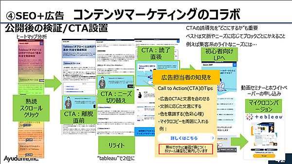 CTAの誘導先は、一律にせず、文脈やニーズに応じてブロックごとに飛び先を変えるほうがよい。またCTAのコピーは、広告担当者はSEO担当者よりもクリックさせるコピー制作の経験が豊富なので、知恵を借りていくのがよいだろうと江沢氏。