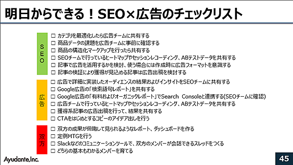 お互いをリスペクトし、同じゴールを共有しながら、SEOと広告のどちらにも精通した人材を育成していく必要がある。そのためには繰り返しコミュニケーションと学びの場を共有することで、学びを共通の資産・文化としていくことが大切だ。最後に、明日からできる! SEO×広告のチェックリストを紹介し、講演を締めくくった。できることからぜひ試してみよう。