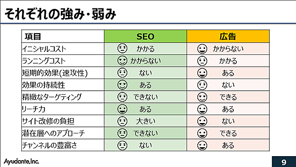 続いて、SEOと広告のそれぞれの強み・弱みを見ていこう。江沢氏はそれぞれの強み弱みを一覧表にまとめた。