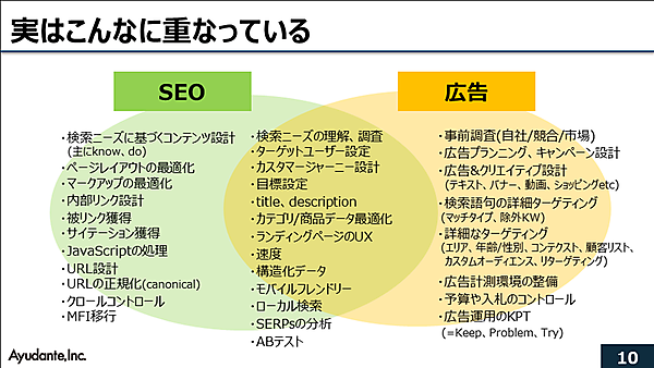次に江沢氏はSEOと広告の担当者が行う業務の図を示した。SEOと広告の業務は、重なっている部分が多くある。図の中央は重なる業務だ。「重なり合っている共通の業務はSEOと広告の担当者が連携しながらすすめると、より大きな効果が見込めると思います」と江沢氏。