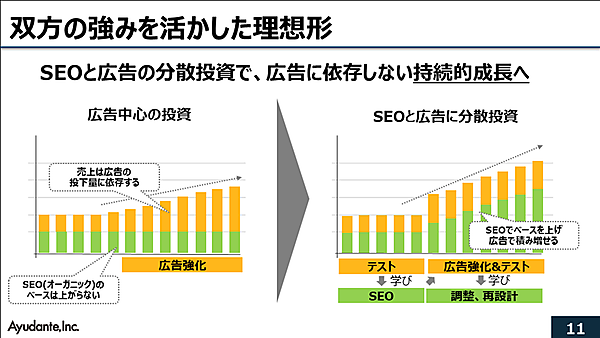 それに対し、理想的な状態は右のグラフだ。広告を使ってテストマーケティングを行い、その学びをSEOに投資をし、デジタルマーケティングの環境を整えていく。それにより、SEOのトラフィックや売上が増えていく。SEOをベースにアセットが実装されることで、広告も効率的に成果に結びつきやすくなる。