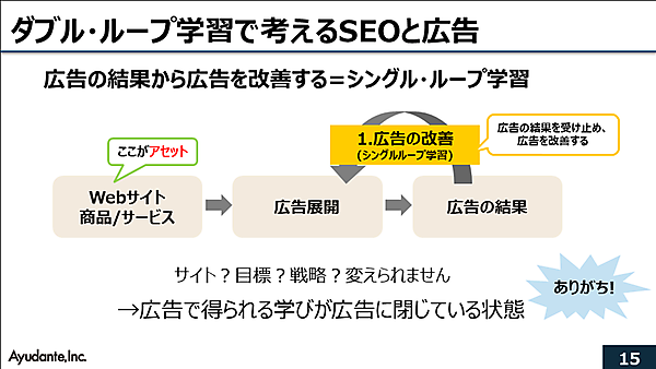 ダブル・ループ学習でSEOと広告を考えてみよう。広告の結果を受け止め、その学びを広告の改善のみにとどめているのは、「シングル・ループ学習」だと寳氏。ウェブサイトの改善には手を出さず、一度決めた戦略や目標からギャップがあったとしても見直しを行わず、ただ広告の改善を続けているような状態だ。