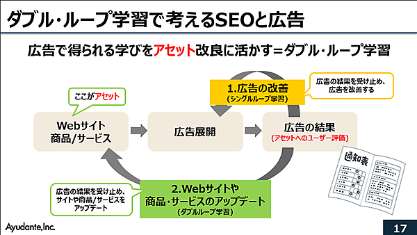 広告はウェブサイトの商品情報や記事といったアセットをもとに決まります。広告の結果はアセットに対するユーザーからのフィードバックです。広告だけの問題にするのではなく、提供している商品・サービス自体や、見せ方、ウェブサイトに問題はなかったか前提から問う必要があります。広告の改善に加え、商品・サービス自体やその見せ方をアップデートして変えること、これがSEOと広告におけるダブル・ループ学習であると言えます(寳氏)