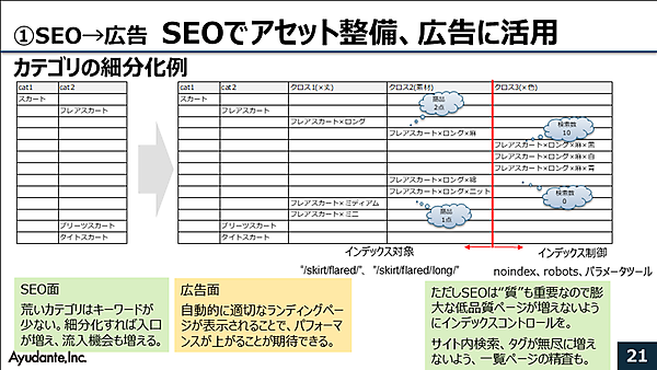 カテゴリの細分化は、広告にもメリットがある。検索広告において、ランディングページが増えることで、広告を細かくターゲティングでき、パフォーマンスアップが期待できる。ただし昨今のSEOでは、ページの品質も重要なので、商品が1、2点しかない内容が乏しいページが大量にできるとGoogleからの品質評価が下がる。そのため、インデックス制御を行うなどのSEO面での対応も重要だ。