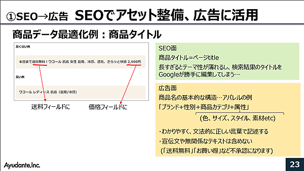 商品ページの改善施策として、商品データの最適化、構造化マークアップの2つを紹介する。商品データの最適化例として江沢氏は商品タイトルを上げた。ある商品のタイトルとして悪い例を良い例を例示した。