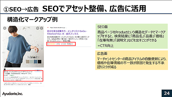 構造化マークアップは広告面でもメリットがあると、寳氏。商品を構造化マークアップすると、Google Merchant Centerで商品アイテムが自動更新され、価格や在庫情報の不一致が原因で発生する不承認リスクが減らせるという。