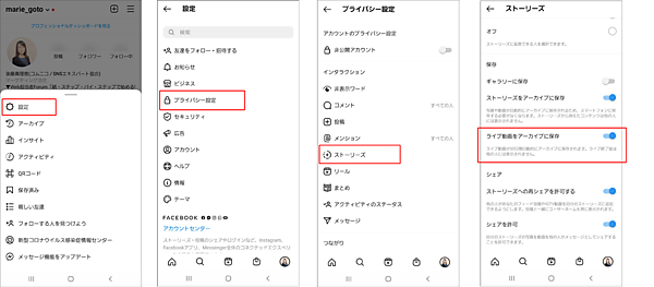 プライベートアカウントなどで事前にテスト配信を行い、ライブ配信の各機能に慣れておきましょう。あわせて、トップページ>画面右上の[三]マークから、[設定]→[プライバシー設定]→[ストーリーズ]を開き、[ライブ動画をアーカイブに保存]がオンになっていることを、事前に確認しておきましょう。これで、配信したライブ動画は自動的にアーカイブされ、後からシェアやダウンロードが可能になります(アーカイブに保存されたライブ動画は30日が経過すると自動的に削除されます)。