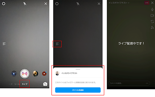 フィード画面で右にスワイプし、画面下メニューから[ライブ]を選択します。画面左中央のメニューをタップして、ライブ配信のタイトルを付けることもできます。準備ができたら、画面中央下のライブ配信マークをタップしてください。ライブ配信が始まります。