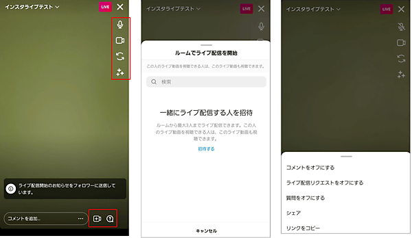 画面右下の?マーク付きふきだしをタップすると、視聴者からのコメントや質問をオフにするメニューや、ライブ配信画面をシェアするメニュー、ライブ配信画面へのリンクをコピーするメニューなどが表示されます。
