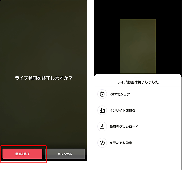 ライブ動画を終了するには、右上の[×]をタップし[動画を終了]をタップします。終了後に表示されるメニューから、アーカイブ動画をIGTVでシェアしたり、インサイトを確認したり、アーカイブ動画をダウンロードしたりできます。