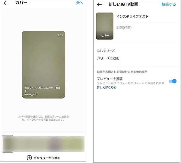 たとえば[IGTVでシェア]をタップした場合には、カバー(サムネイル)や説明(任意)などを設定し、画面右上の[投稿する]をタップすることでアーカイブ動画がIGTVにシェアされます。