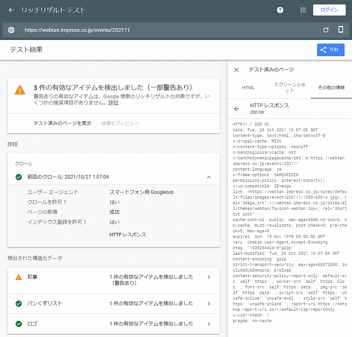 それぞれ、ツールとしてはもともと「AMP検証のため」「スマホ対応のため」「リッチリザルトの状況を検証するため」に特化したツールではあるが、内部的に利用しているシステムは同じだ。すべてのツールが次のデータをレポートする。