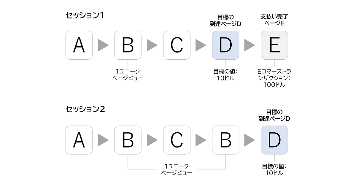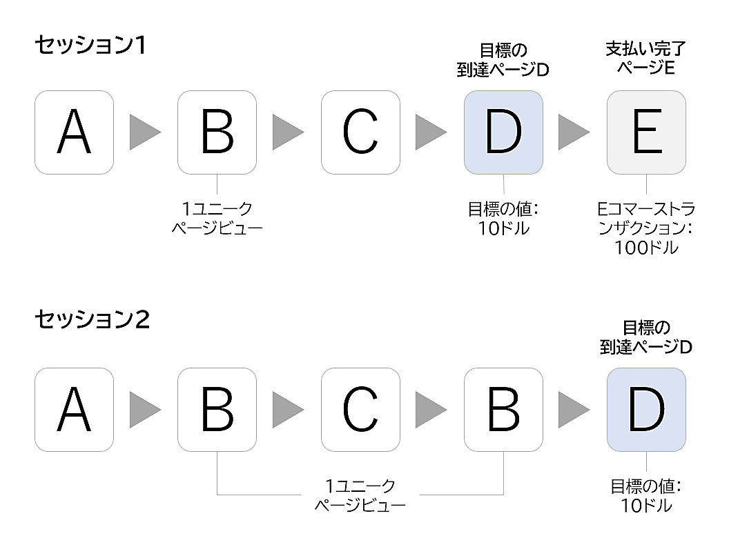 ここでは2つのセッションがあるが、Eコマーストランザクションに到達したのは1つ(セッション1)だけだ。つまり、ページBのユニークページビュー数が2※でも、Eコマースの収益は変わらない。