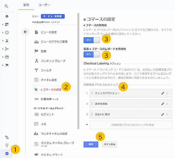 - 「eコマースの設定」を有効にして、適切に設定する