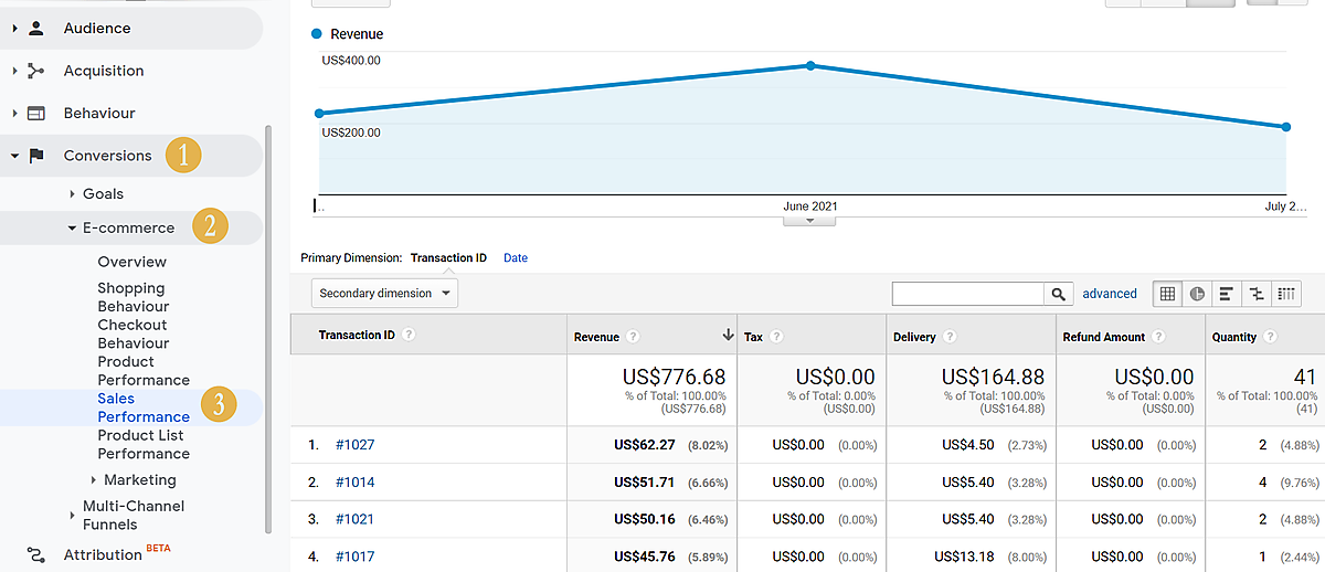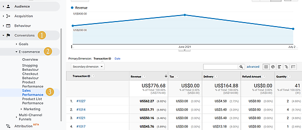 販売実績を表示するには、eコマース設定を行ったサイトでトランザクションが発生したあとに、Googleアナリティクスの左側のパネルで、[コンバージョン]>[eコマース]>[販売実績]をクリックする。