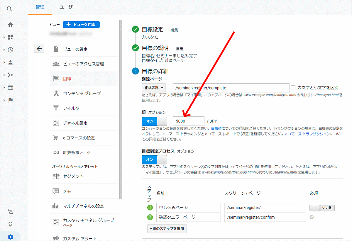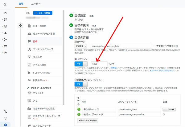eコマースの設定に関しては本記事の航続部分で解説しているが、ECサイト以外の人は、目標を設定してコンバージョンがもたらす価値を「値」に指定しておくといいだろう。