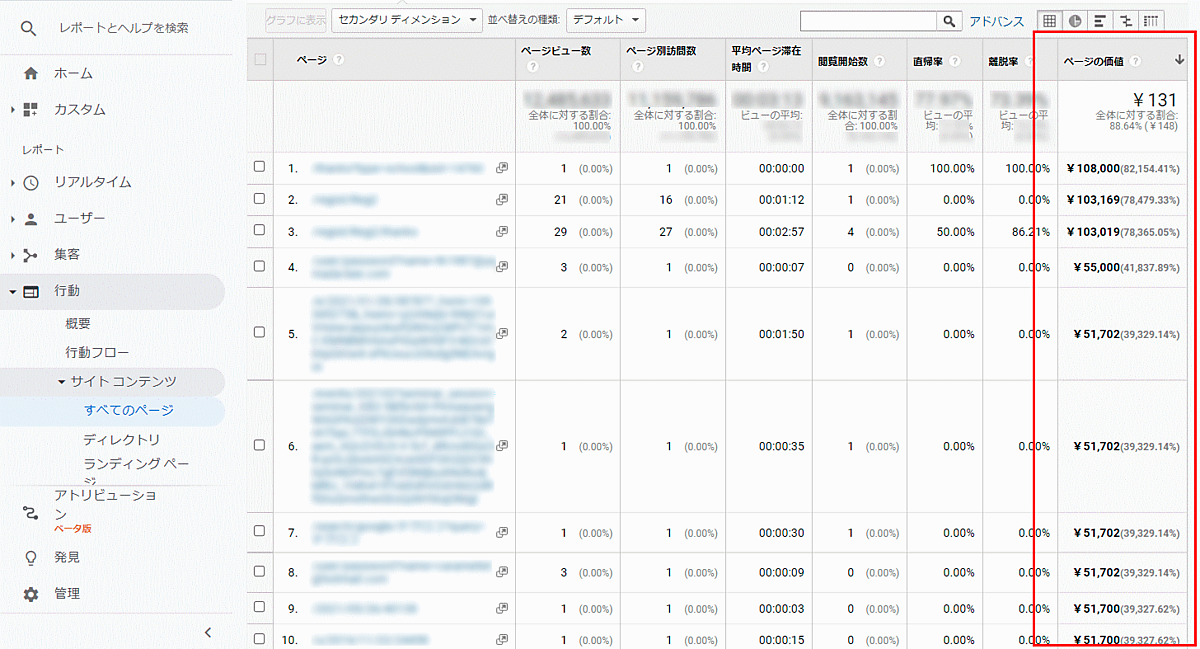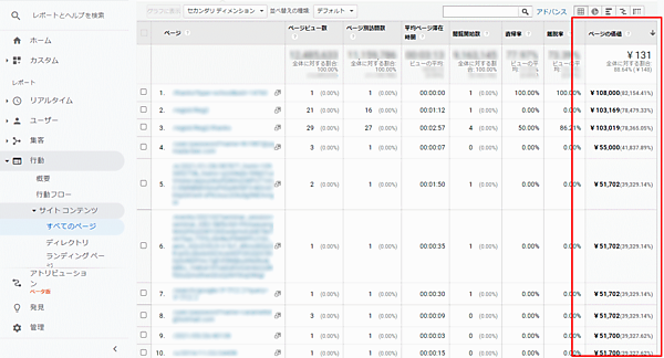 Googleアナリティクスの「ページの価値」は非常に有用で、レポート上でもどのページがどの程度のビジネス価値を生み出しているか確認できる。