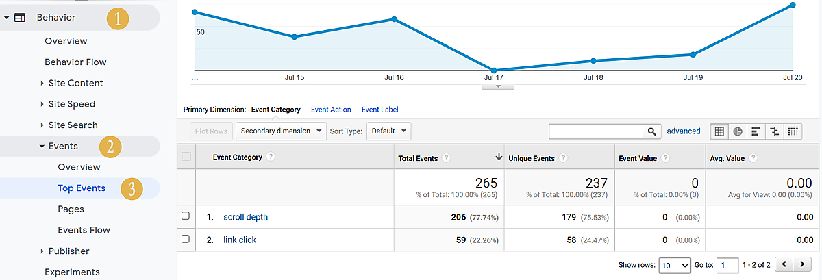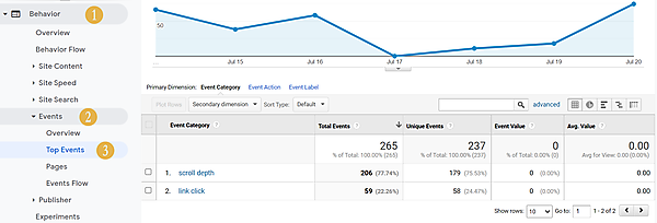 エンゲージメントデータを表示するには、イベントトラッキングを実装したサイトでデータが貯まったあとに、Googleアナリティクスの左側のパネルで、[行動]>[イベント]>[上位のイベント]をクリックする。