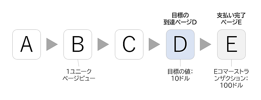 - Googleアナリティクスの目標で設定している到達ページDに行き(目標の「値」で10ドルの価値が割り当てられている)
