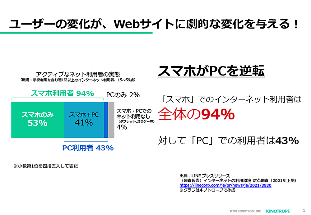 そして現在は、Webの利用はスマホ主流になっています。次の図のように、LINEの調査(インターネットの利用環境 定点調査 2021年上期)によると、アクティブにインターネットを使っている人の94%がスマホを使っているという現状があります。スマホだけで利用しているという人も53%にのぼります。