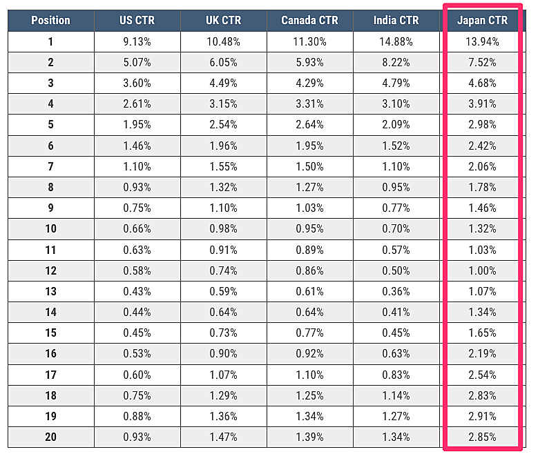 たとえば、1位〜20位のCTRを主要5か国で集計したのが次の表だ。日本のデータは右端列にある。検索結果1位のCTRは13.94%と、他の主要国と比べてもかなり高い。