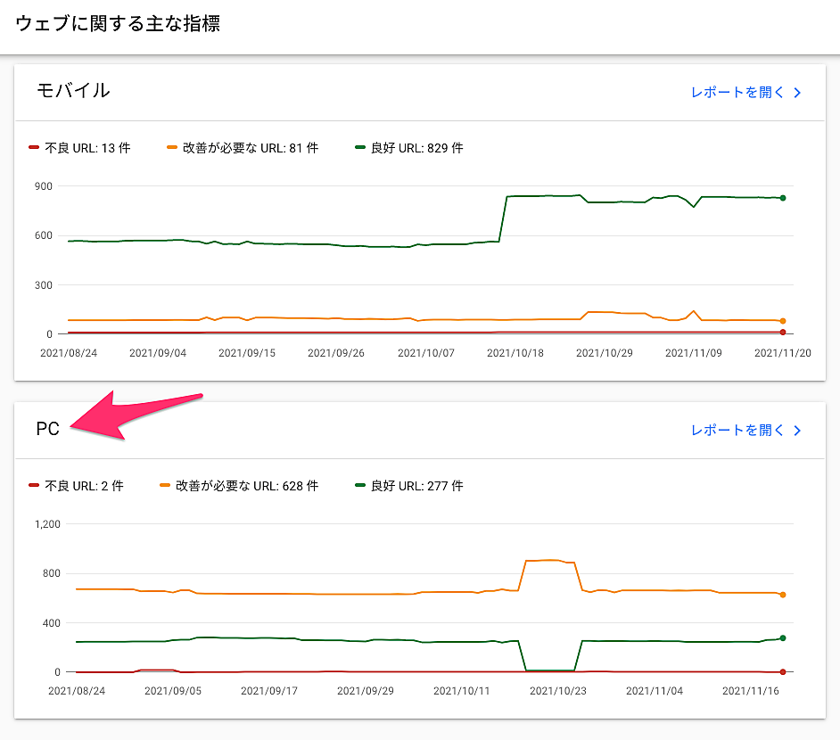 HTTPSや煩わしいインタースティシャルの状況はSearch Consoleに頼らなくても、ほぼ把握できるだろう。問題になるとしたらコア ウェブ バイタル(LCP/CLS/FID)だろうが、こちらはウェブに関する主な指標レポートでPC向けページも状況を監視できる。改善が必要なページや不良のページがあれば今のうちから改善に取り組んでおくといい。
