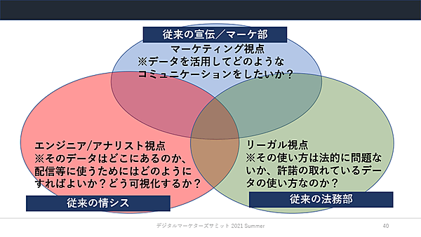 上図のように、従来、宣伝・マーケティング部門、情報システム部門、法務部門が担っていた領域が複雑に絡み合ってきているという。今後は、従来の領域の枠組みを超えた課題解決のケースが増えていくことが考えられる。しかし、3つの領域のスキルをすべてもつ人材は、なかなかいない。