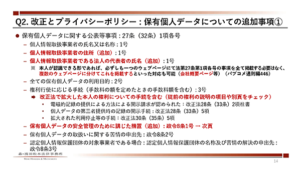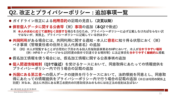 特に、「プライバシーポリシー」関連では、利用目的のチェックは必須。安全管理措置についても、「支店・駐在員事務所、委託先・再委託先・クラウド事業者を含めた外的環境の国名の把握は早めに準備してほしい」と呼びかけた。