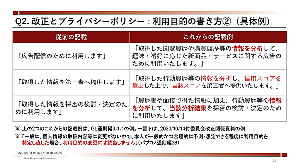これにより、プライバシーポリシーの記載はどう変わるのか。たとえば、従前の記載では「広告配信のために利用します」だったものが、今後の記載例では「取得した閲覧履歴や購買履歴等の情報を分析して、趣味・嗜好に応じた新商品・サービスに関する広告のために利用します」などのように、「分析」の部分に踏み込み、最終的にどう利用するかを明確に説明する必要があるというのだ。