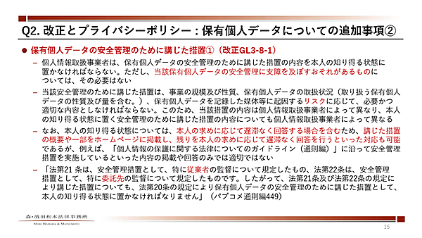 田中氏は、「本人の求めに応じて遅滞なく回答を行うといった対応も可能だ」とした上で、「どのように安全に個人情報を管理しているのかを、どこまで具体的にプライバシーポリシーに記載するかを検討する必要がある」と説明した。また、安全管理措置については、従業員だけでなく、委託先の監督についても把握し、説明を可能にしておくことが重要だとした。