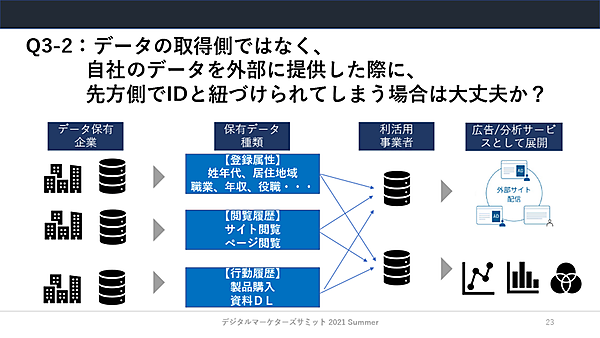 一方で、次図のように、自社が保有する属性データや閲覧履歴などの行動データを外部に提供するケースも考えられる。提供先の事業者側で、IDと紐づけて広告・分析サービスとして展開することが考えられる場合、気をつけることはどんなことだろうか。