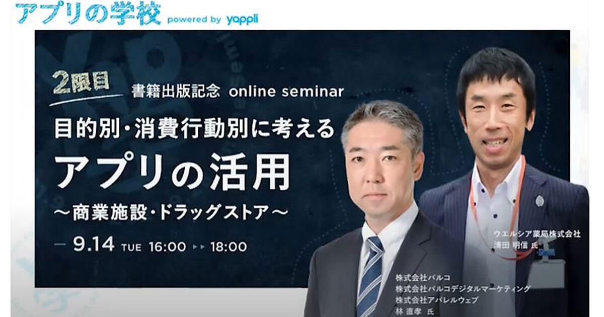 アプリをマーケティングツールとして活用するには、DLしてもらうための施策や使い続けてもらうための施策が必要になってくる。顧客と接点を作り、アプリを通じてどうコミュニケーションをとるべきか。パルコの林直孝氏と、ウエルシア薬局の清田明信氏が語った。モデレーターはヤプリの半大二郎氏が務めた。